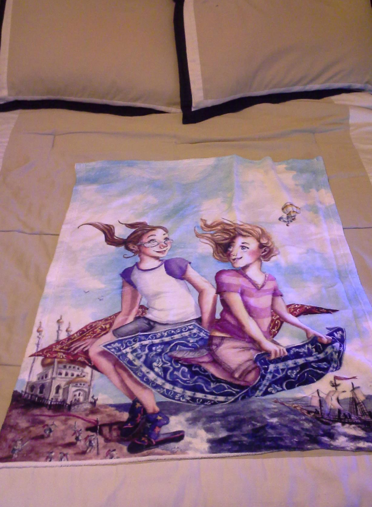 To add some fun to the event, I’m also collecting items for a raffle basket that will include signed copies of both Sarah & Katy books, an imagination blanket (shown at left), and a few other as-yet-t0-be-determined items. One idea is to order customized notebooks featuring the Book of Blank cover on them — that way the winner will their own “book of blank” to fill with a story of their own making.